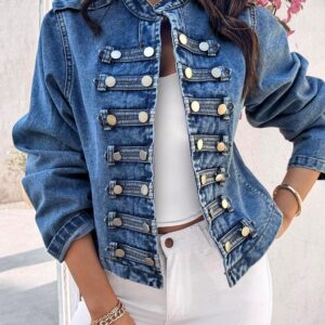 Details:Stand Collar, Stylish Symmetrical Metal Buttons, Long Sleeves