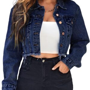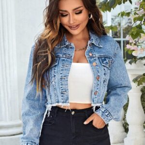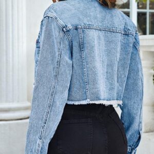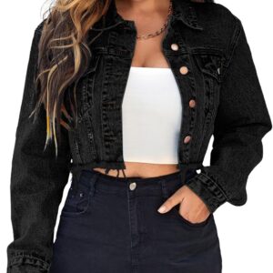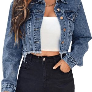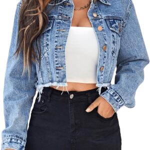 Floerns Women’s Raw Hem Long Sleeve Button Down Pocket Cropped Denim Jean Jacket