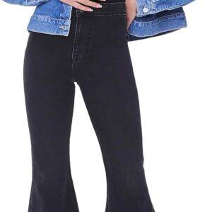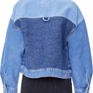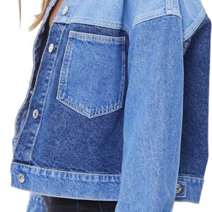 A denim jacket featuring a colorblock design, chest flap pockets, dropped long sleeves, button-front closures, and a basic collar.