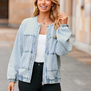 Glamaker Womens Denim Bomber Jacket Trendy Casual Zip Up Crew Neck Long Sleeve Loose Fit Jean Jacket Fall Outfits