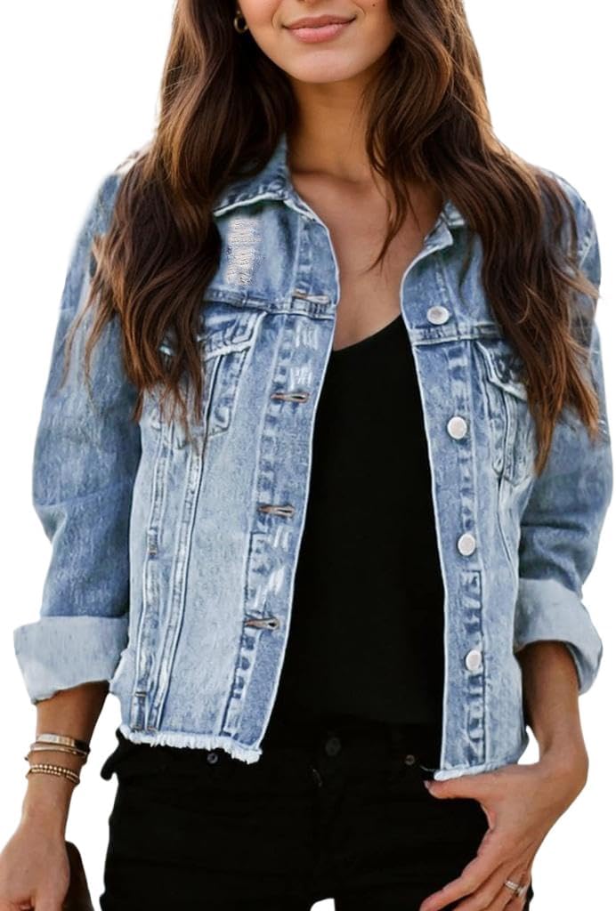 Kedera Womens Denim Jacket Distressed Frayed Ripped Jean Jacket Casual Button Down Light Jackets with Pockets