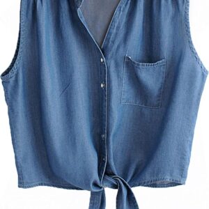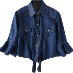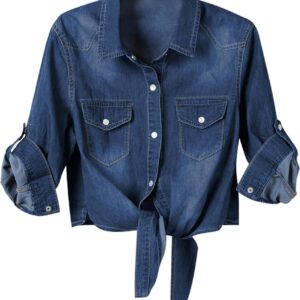 Omoone Women’s 3\/4 Sleeve Denim Crop Top Tie Knot Shirt Cardigan