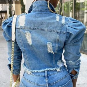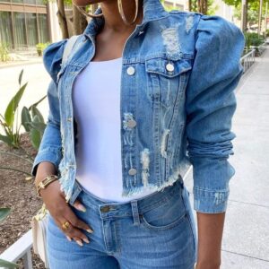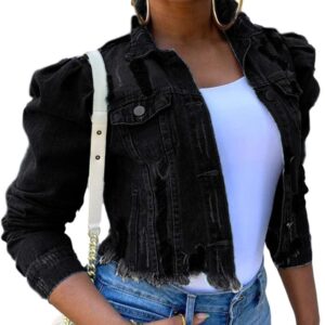 Omoone Women’s Ripped Puff Sleeve Denim Crop Top Long-Sleeve Cropped Jean Jacket