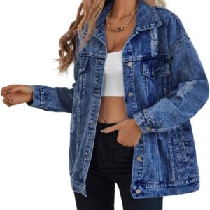 Women's Oversized Mid Long Denim Jacket Distressed Ripped Long Sleeve Jean Jacket Coats