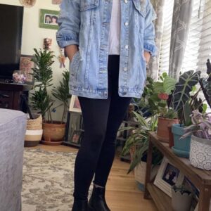 This trendy denim jacket is a classic staple for every fashionista – perfect for layering with all of your fall outfits! Featuring a light wash color, edgy distressed/shredded detailing and pockets, you are sure to love this cute jacket! This classic jean jacket has a slightly oversized fit, leaving room to wear long sleeve tops underneath. We are loving this denim look over a cute graphic tee and a pair of black leggings with trendy sneakers or boots for a casual and fashion style.