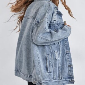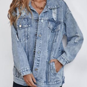 - Oversized Distressed Flap Pockets Denim Jacket, Ripped Long Sleeve Denim Coat.