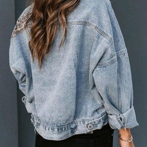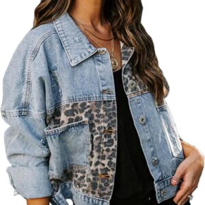 RINTONIX Womens Loose Button Down Cropped Distressed Leopard Denim Jackets Washed Long Sleeve Ripped Cheetah Jean Coat