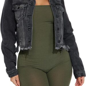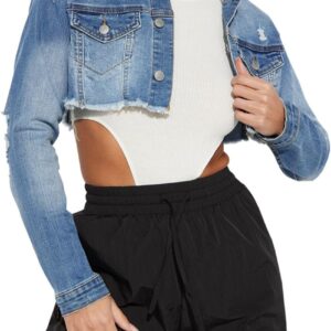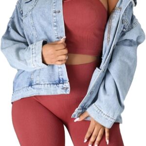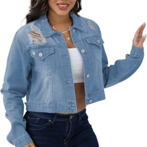 Elastic Ripped Women's Denim Jacket – Plus Size with Pockets Twisted Long Sleeves