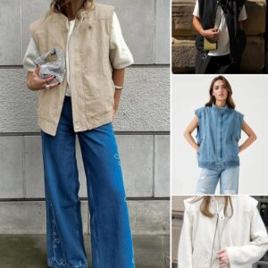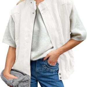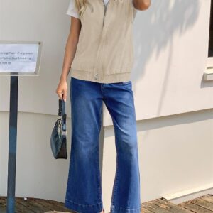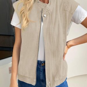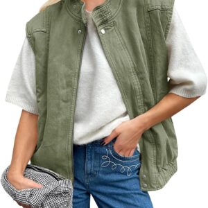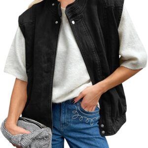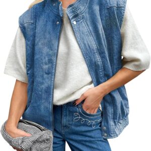 Tankaneo Womens Denim Vest Stand Collar Zip Up Jean Vest Utility Cargo Sleeveless Oversized Jackets