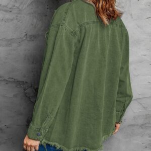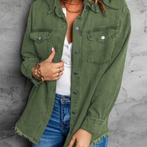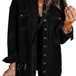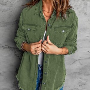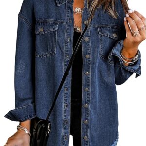 Vetinee Women\u2019s Oversized Button Up Frayed Hem Shacket Long Sleeve Pockets Denim Jean Jacket
